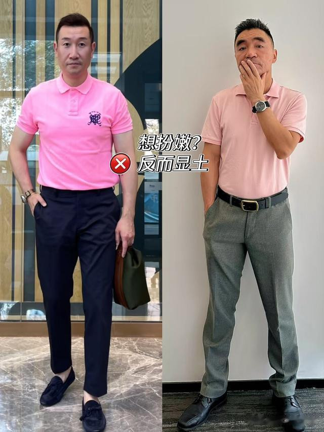 玫红色、浅粉色这些颜色,可真的没有你想象中的那么显年轻!本身这类颜色就有一些女性化的气质,中年男人穿上其实并不能显年轻,反倒是会少一些男子气概,和中年男人的气质实在不搭。