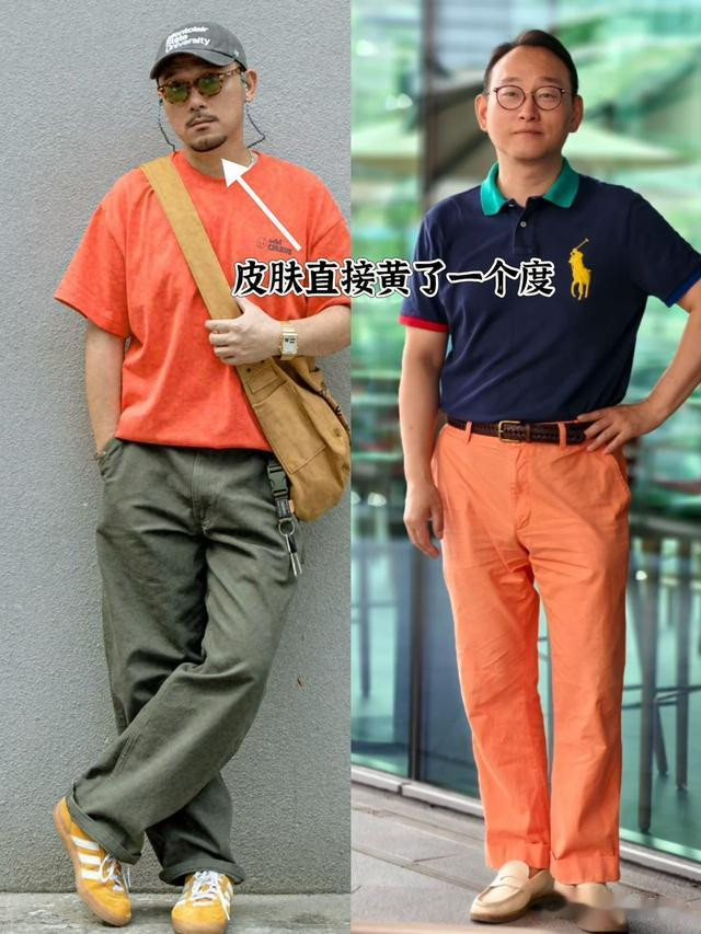 到了中年,皮肤状态几乎都不会太好,而橘色过于鲜亮,视觉冲击力太强,一般人很难驾驭得住。黄黑皮的兄弟穿上,肤色会被衬托得更加蜡黄。