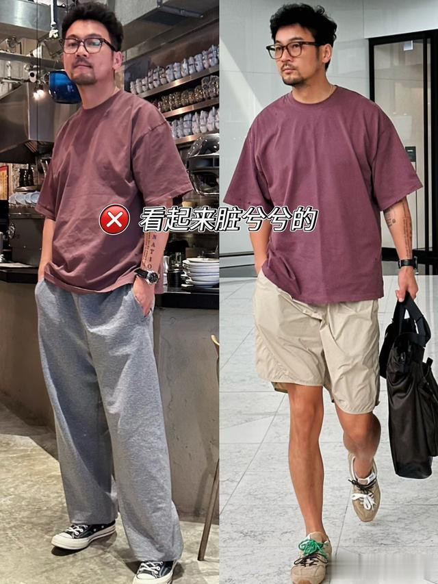 对于那些皮肤暗沉甚至有些黄的中年男人来说,穿暗沉色的衣服也会导致皮肤状态变得更差,比如这类猪肝色的衣服,本身没有亮度,大面积地穿在身上显得整个人肤色暗沉了一个度,要是还不刮胡子,配短裤踩着拖鞋就穿出门,是不是很邋遢?